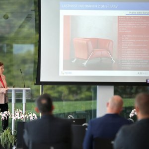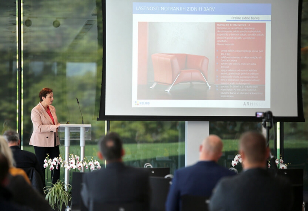 The Chamber organises the Arhikult conference every year to promote architecture. The main topics relate to architecture, culture and public spaces. It includes various lectures that cover timely themes, which are given by renowned experts from various fields. Cirila Colnar Mikeln, who is responsible for research and development of decorative coatings in the Helios Group, spoke this year. Her lecture covered the properties of interior wall paints and the EN 13 300 standard. The programme ended with announcements and the Arhikult awards, which are made in the architectural categories of buildings, renovations, interiors and public areas. During the conference, the lobby was used to exhibit manufacturers’ materials and construction and architecture equipment.